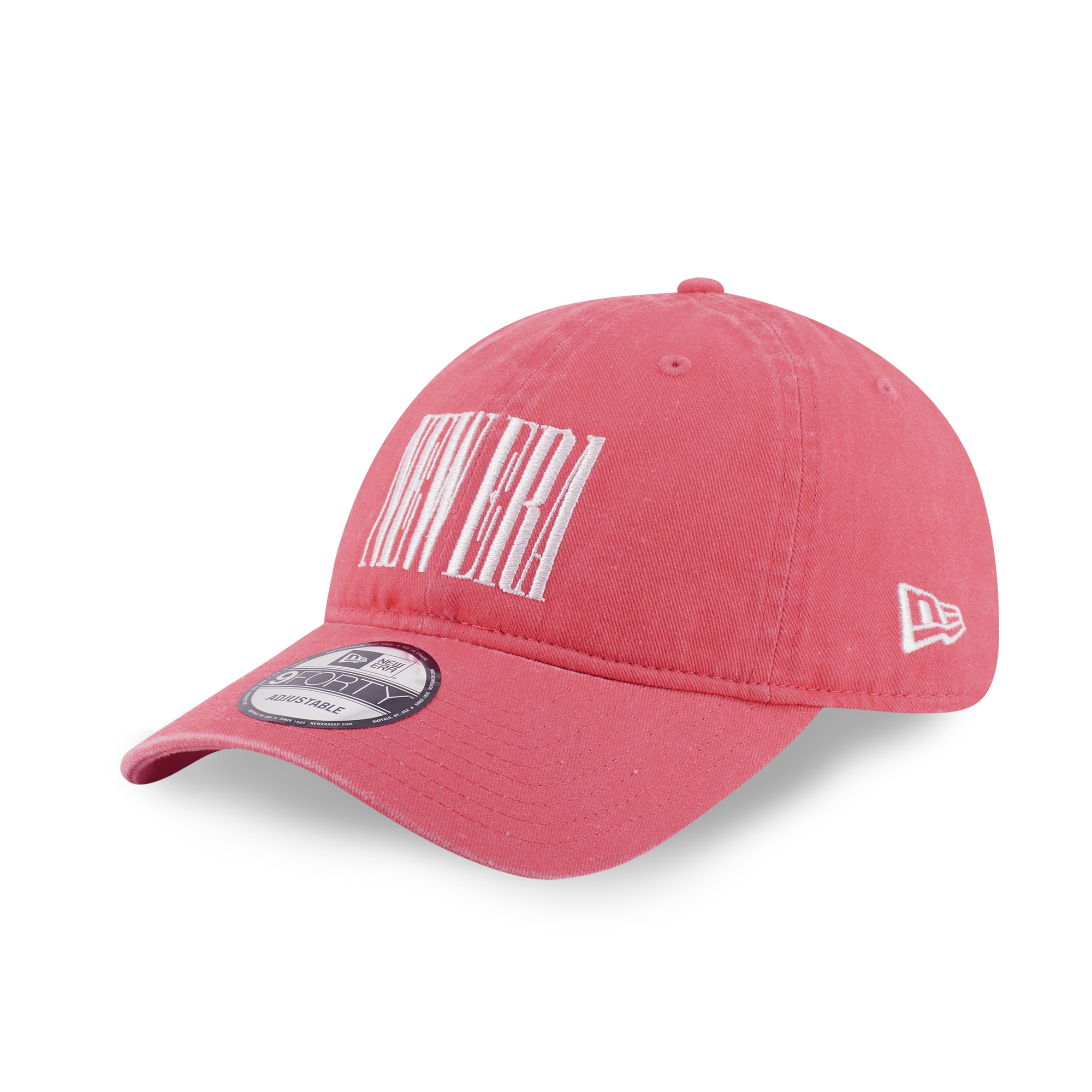 Rendered in Coral, the washed crown features a “NEW ERA” wordmark at the front and a “1920” wordmark at the rear arch.