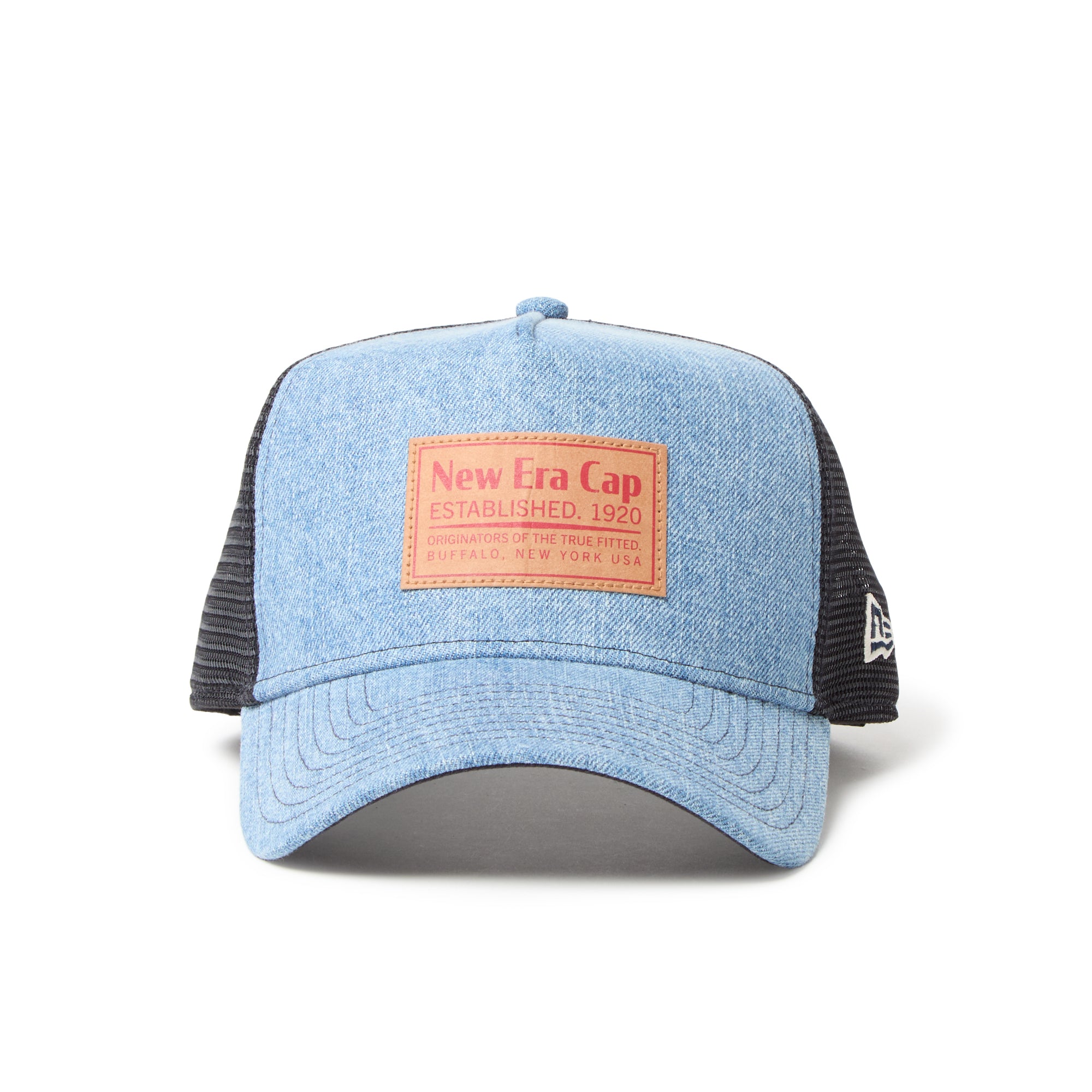 Buy the New Era 9FORTY A-Frame Trucker Woven Patch Blue Washed Denim Snapback Cap at urbanAthletics!
