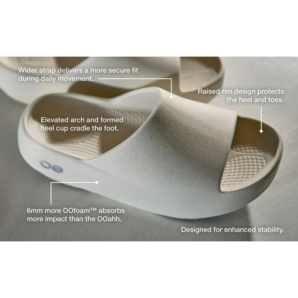 The new shape of comfort is the OOahh PLUS. We took our best-selling slide and maximized the plush factor for a shoe that blends softness and stability. Designed to surround your foot in OOfoam™, the wide, streamlined strap securely locks you in, and the sculpted footbed hugs your sole for a cloud-like feeling. This is modern comfort with serious style points.